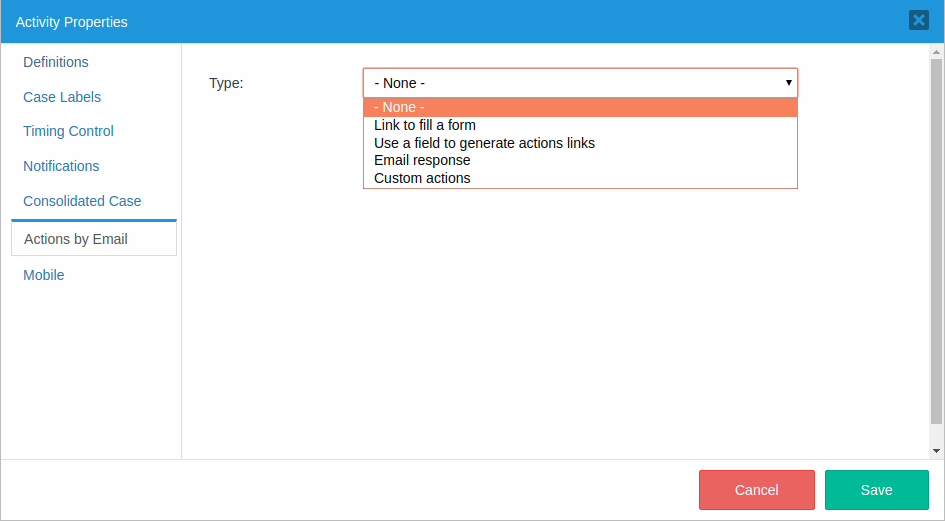 - Link to fill a form: A link to a form is sent to the user's email. When the user submits the form, it saves any data entered into the form and routes the case to the next task in the process.
