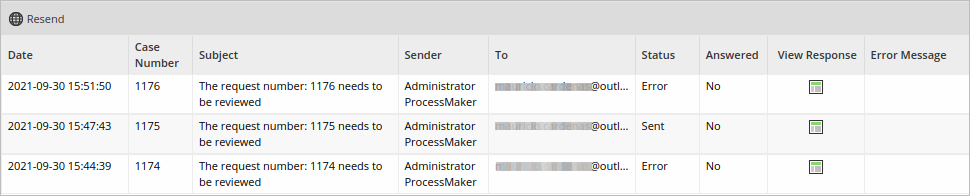 Note: If an Actions by Email step occurs after a Script or Service Task that does not have an assigned user, the Sender column does not show any user because a user did not run the Actions by Email step. As of ProcessMaker 3.7.0, the Sender column displays the title of the Script or Service Task.