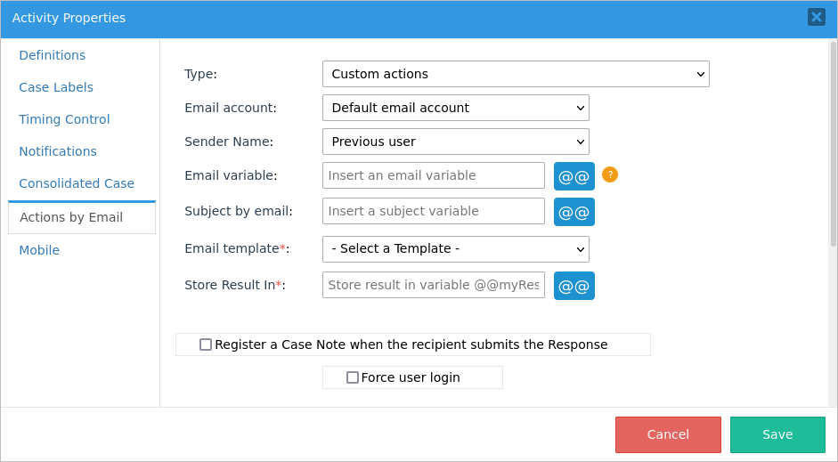 - As a best practice, do not configure the current task to use Actions by Email, and then route cases of this task from the email to tasks that require manual assignment. This will cause errors in case run time because there is no way in the email to manually select a user in which to assign the task.