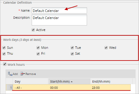 Note: Take into consideration that Triggers and Cron Tasks use the Default Calendar configuration along with the Time Zone configuration. Therefore, it is strongly recommended to set the "Default Calendar" configuration to 00:00 - 23:00 hours for all the days of the week in order to allow their executions without problems.