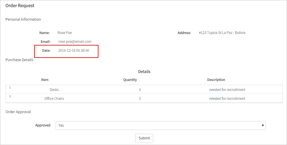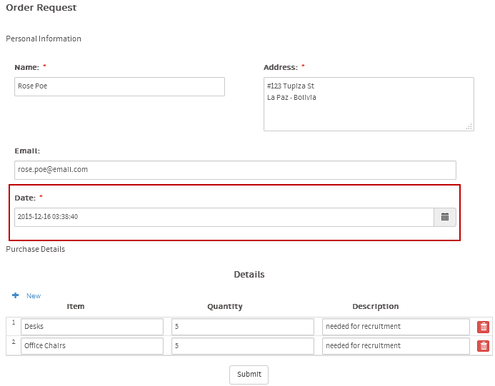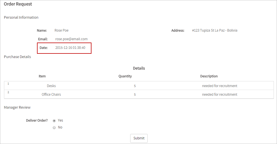 For the example, employee "Rose Poe" who works in La Paz - Bolivia (UTC - 04:00) will start a case of the process to send her request. The form that she must fill includes the date and time when she sends the request: