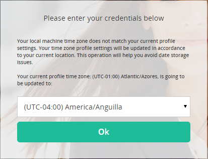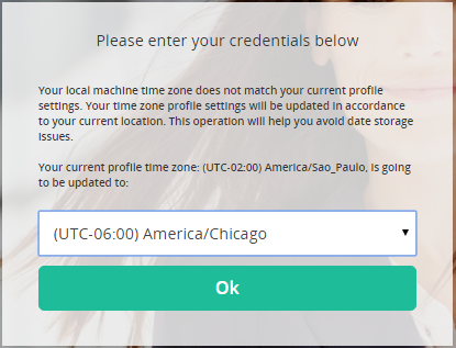 After logging on, the Time Zone dropdown displays if the time zone defined in the user profile does not match the computer time zone. Follow the next steps to update your user time zone: