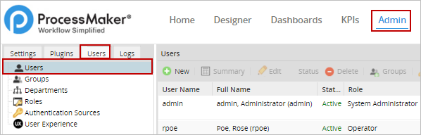 The list of all users inside ProcessMaker will be displayed at the right. The configuration of the Time Zone must be done one user at the time. Select the user from the list and click on Edit.