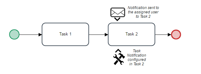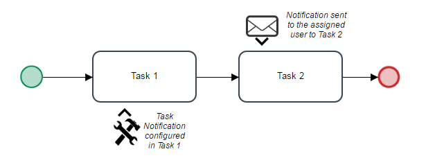 - Notify the assigned user to this task: The process will send the notification to the assigned user of the current task when the configured task is assigned to them. This option is useful when the process design has script tasks, loops or gateways and it is difficult to determine the next assigned user. Notice that when this option is configured in the first task of a process, the notification will not be sent unless there is a loop returning to the first task.