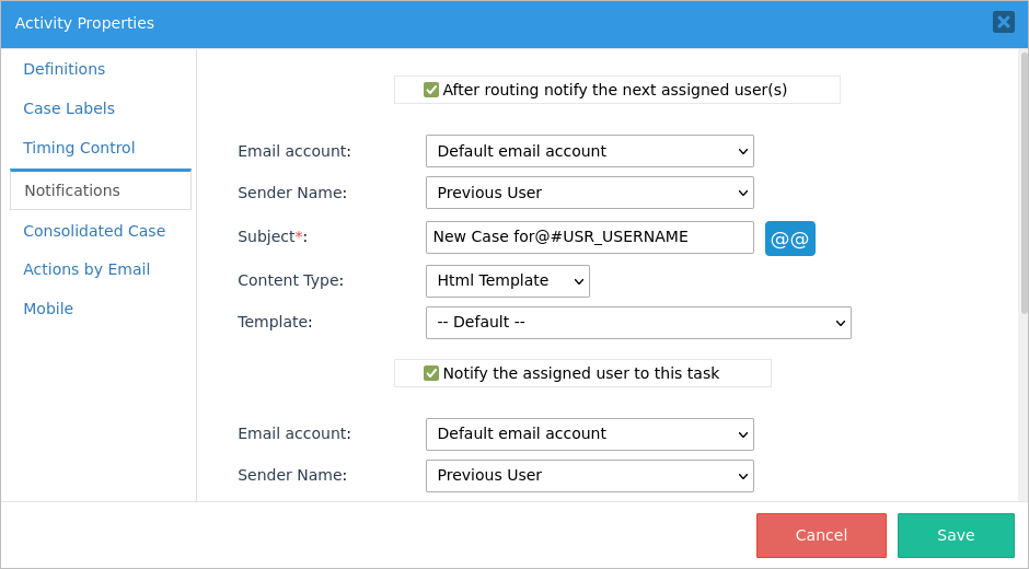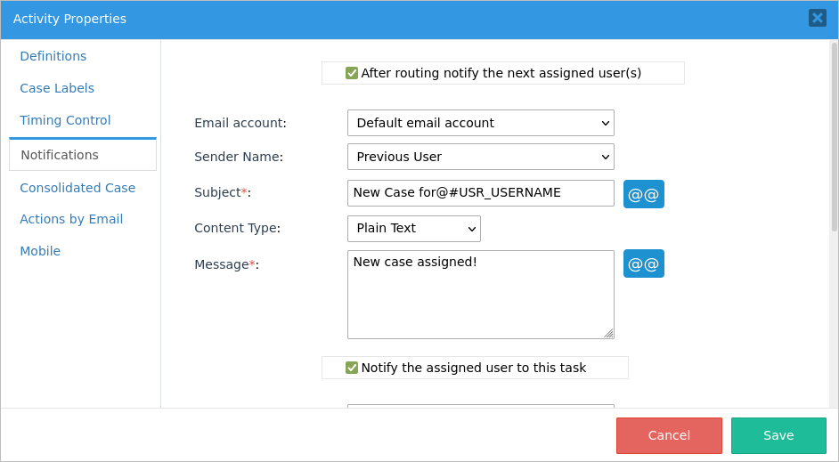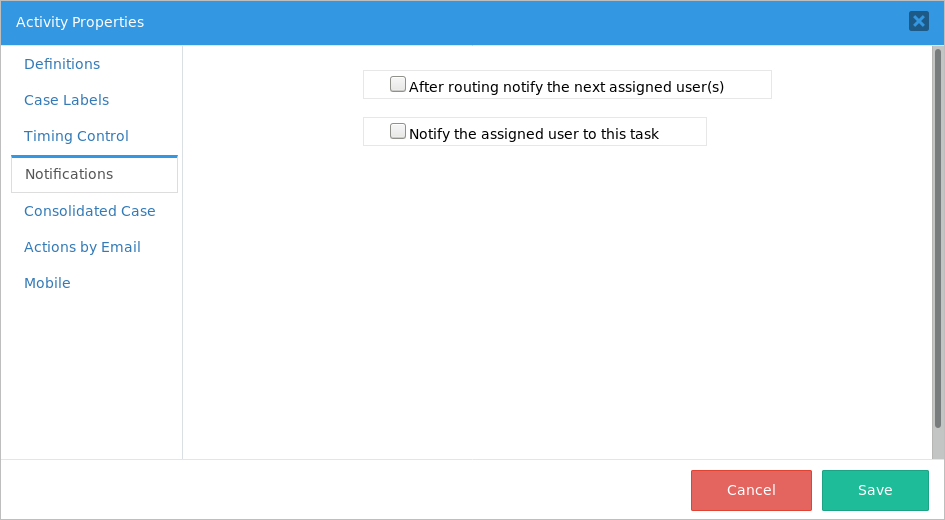 - After routing notify the next assigned user(s): This option was included in previous ProcessMaker versions; the process locates the next task and sends the notification to the assigned user.