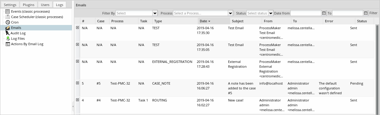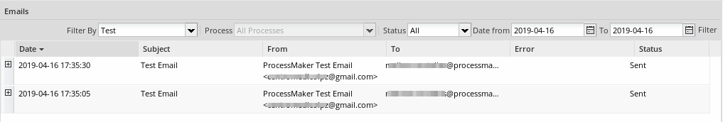 - Test: Displays only records of emails that were sent by testing an Email Server configuration. If this option is selected, the Process dropdown filter will be disabled.