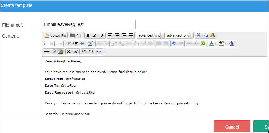 The template file will determine the body of the email message. This text can contain system and case variables and HTML tags. For more information on the format of template files, see Output Documents.