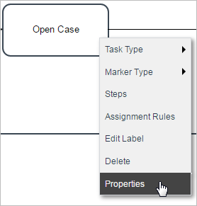 To create a message to be sent to an assigned user, go to the Designer menu and open a process for editing. In the process map, right click on the task that should send out notifications when users are assigned to work on the task when running cases. In the dropdown menu that appears, select the Properties option.