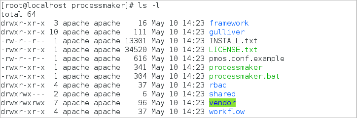 -poption preserves the permissions of existing files. To verify these permissions and the owner of the processmaker directory, use the commandls -lls -l /opt/processmakerThe information displayed will look similar to the image below, which was made using a CentOS installation.