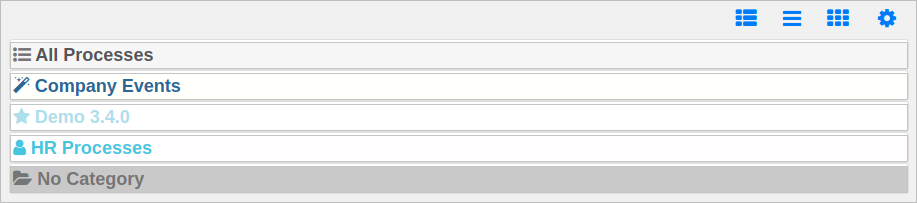 • All in One (Table): This is the default option. This displays all the Categories and all the processes created in ProcessMaker.