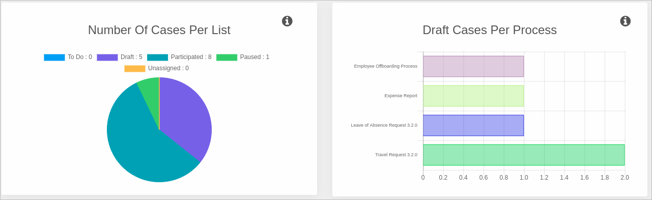 For the role members that were granted access to the Case Metrics option, it displays in the new submenu. The Case Metrics option displays general information about all cases and it displays as a different dashboard than the ProcessMaker default.