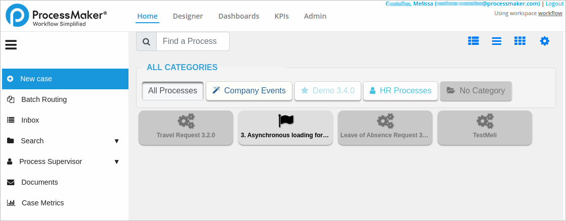For the role members that were granted access to the new Start Cases view, the New Case interface displays all the Categories and processes available by default. Categories function as filters: selecting a Category only displays processes assigned to that Category.
