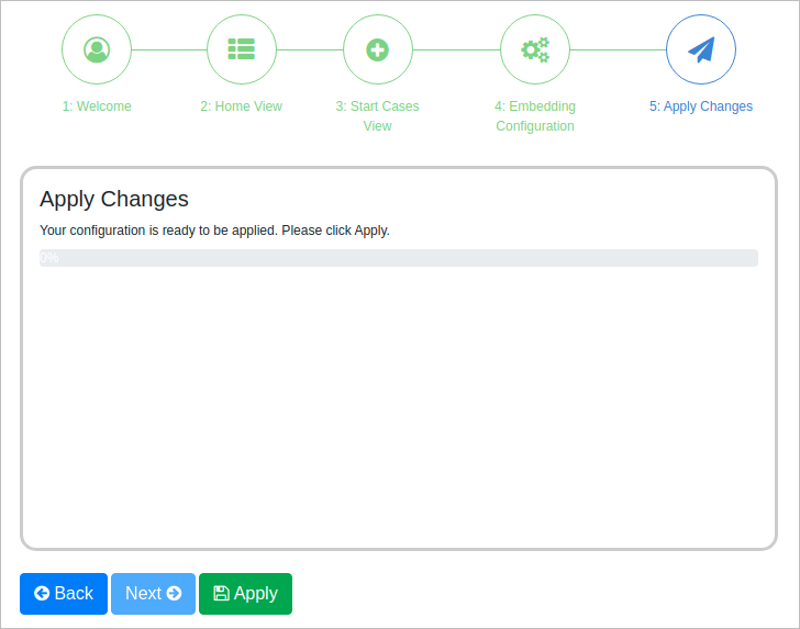 6. After clicking Next from the Embedding Configuration screen, the Apply Changes screen displays. Click Apply to apply your previous changes in the configuration wizard. The Enhanced Home Experience plugin applies your ProcessMaker role settings.
