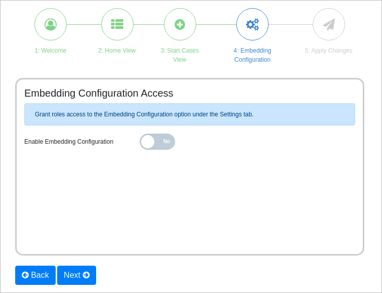 1. Select the Start Cases View option from the Select What Would You Like To Embed drop-down menu. The Embedding Configuration feature previews how the embedded processes would display when the URL is accessed.