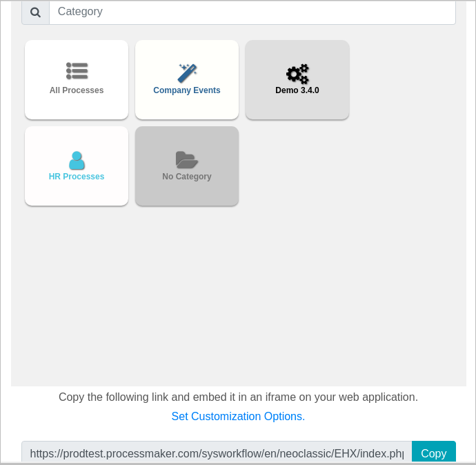 • Generate the URL from which users access the embedded processes: Click the Copy button below the preview to copy the generated URL. Share this URL with users who will access the embedded processes to start cases.