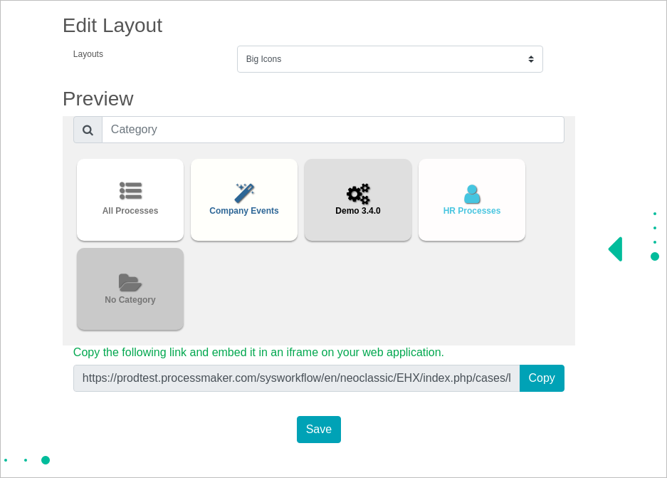 The Edit Layout screen displays. Use this screen to customize the layout for categories when the embedded processes are accessed from the generated URL.