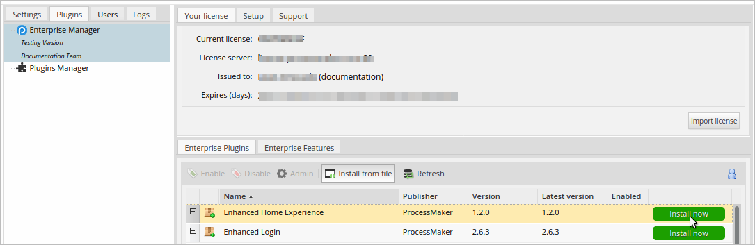 3. In the Enterprise Plugins tab, install the Enhanced Home Experience plugin doing one of the following: