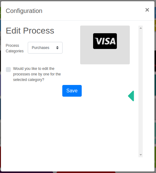 You can save your changes by clicking Save, or you can go back to editing by clicking the green arrow. Check the Would you like to edit the processes one by one for the selected category? option to be able to change the icons and color of the process in the selected category and save the changes one by one.