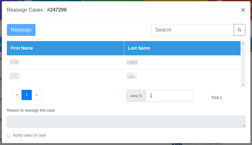• Reassign: This option allows you to reassign a case to a different user. This pop-up screen displays the following: