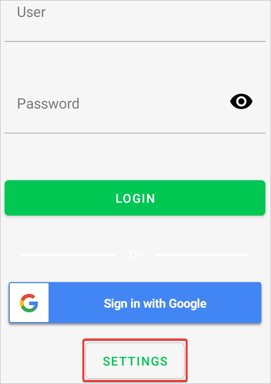 The logon screen displays. Tap the Settings button to configure the server.