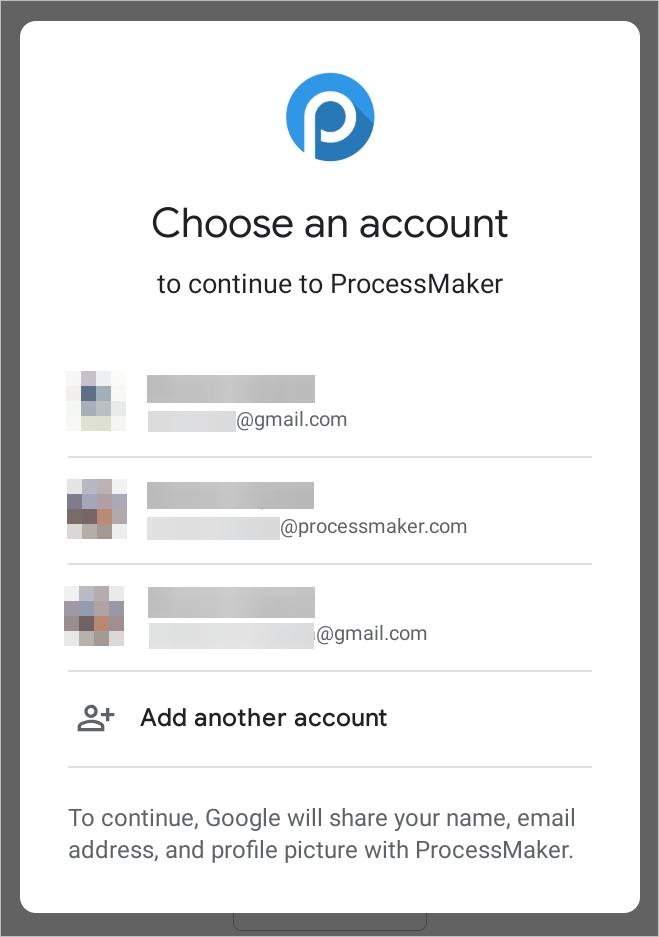 A window (Android) or a screen (iOS) displays a list of Google accounts already registered in the device. Select an account to sign on to the ProcessMaker Mobile app. Otherwise, if there is no account listed, tap Use another account.