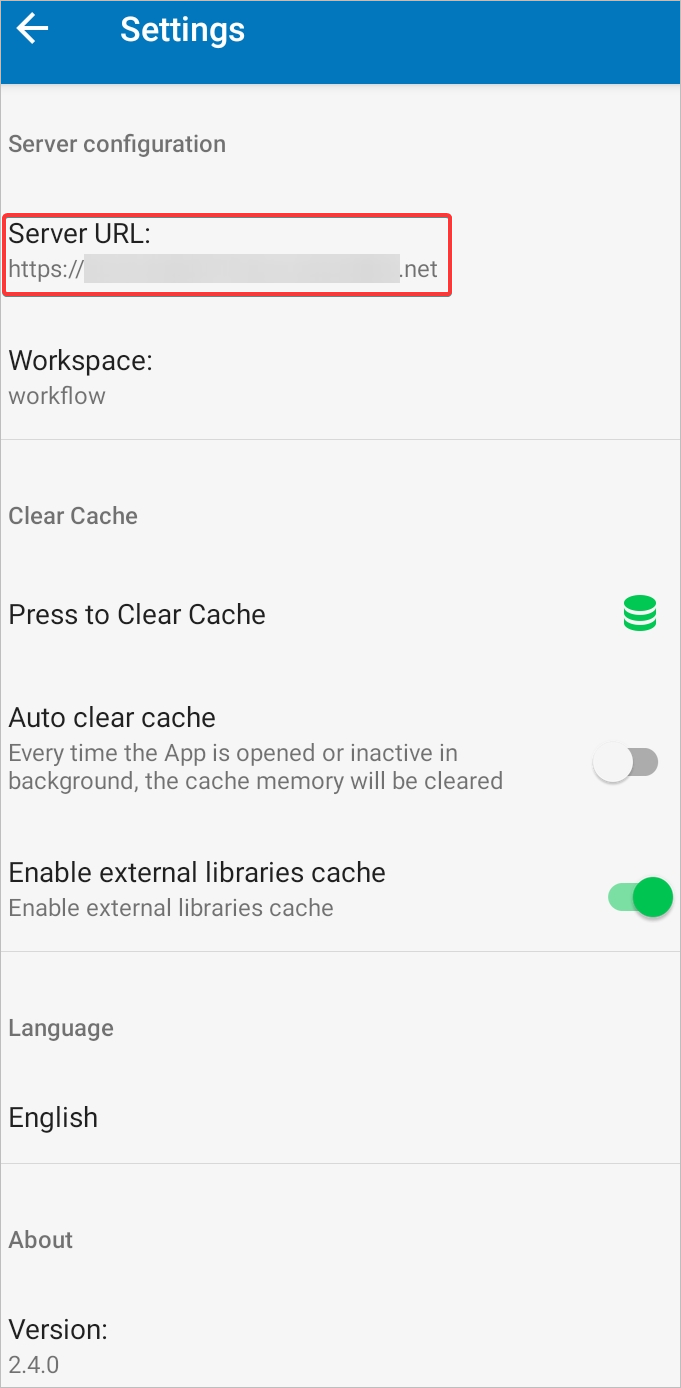 After saving the server URL, the Settings screen displays again. Tap the Workspace field.
