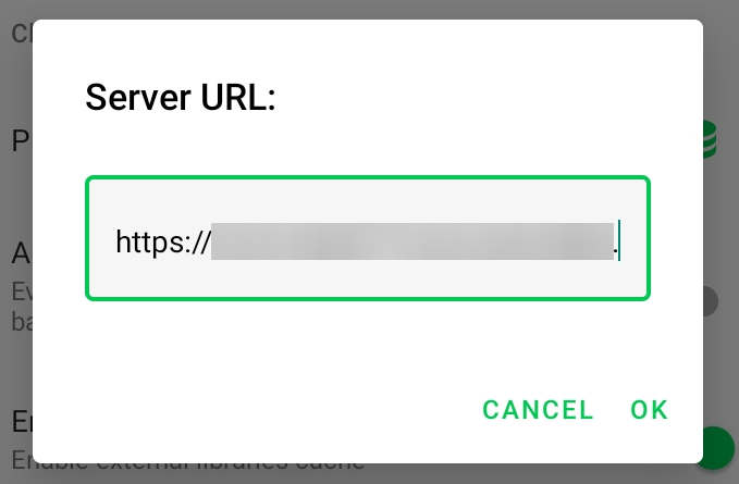 The Settings screen display. Tap the Server URL field.