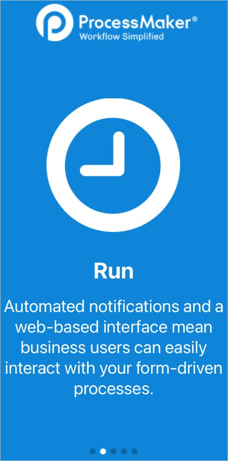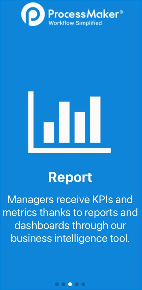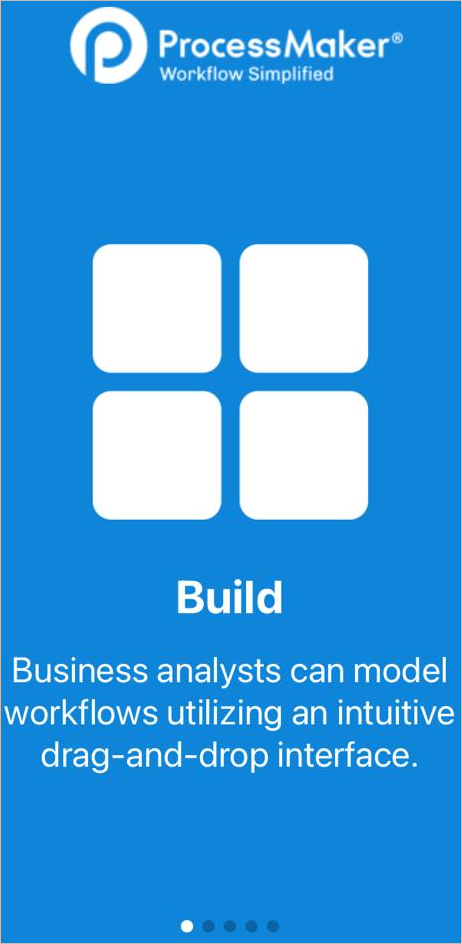 The first time that ProcessMaker mobile is opened, a summary of the product features displays. Each of the screens shows a brief description of a few ProcessMaker Mobile functions: