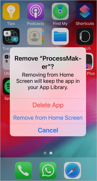Tap on the "x" in the top left corner of the ProcessMaker icon and a confirmation screen appears. Tap on the Delete button to erase ProcessMaker Mobile from your device.