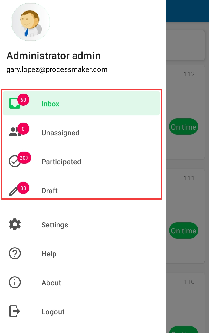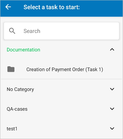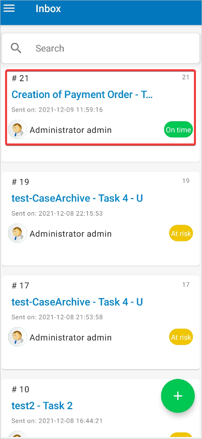 Inside the ProcessMaker app, go to the Case List, tap on Inbox and look for the Process used as an example, "Creation of Payment Order" and tap on it.