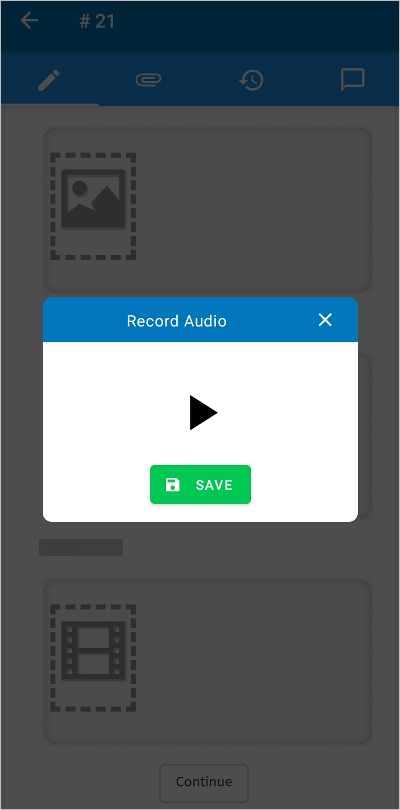 The fifth mobile control in the form is Audio which allows the user to record sound. The user can either select an audio file from the gallery or record a new one. If new audio is recorded, the buttons Record, Stop, Play and Save will appear sequentially. Record audio and then play it until your are sure that is the audio wanted, then save the recorded audio that will be shown in the "Audio" field.