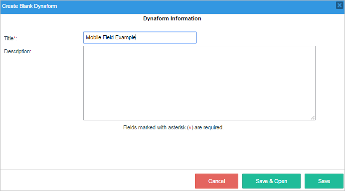 To use mobile controls, first create a Dynaform in the ProcessMaker Enterprise edition (the mobile controls are NOT available in the community edition). This Dynaform will contain all the available controls for the mobile application to test and observe their behavior. Create a new Dynaform with the name "Mobile Fields Example", add a description if needed, and then click on the Save and Open button.