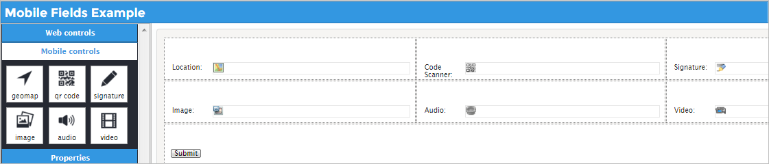 Designers have an extra section in the web edition of ProcessMaker Enterprise, where additional controls supported by the mobile application are rendered. These additional controls allow the user to submit data from their phone that is not possible to submit in the web edition, such as images, audio, and video.