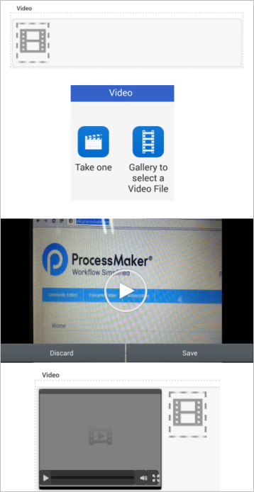 Finally, the last mobile control in the form is Video. Choose a video from the gallery or take a new video. When taking a new video, the options to discard or save the video will appear. If the video is discarded, then a new video can be taken; if saved, then the video is kept in the "Video" field.