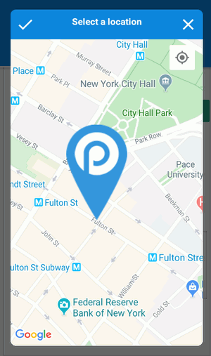 Tap on the "Location" field to open the Geomap control, then tap on the target icon to get your current location (the Location Service on your device must be enabled), or slide the screen to select the location by yourself. Once ready, press the check icon on the top-left of the screen.