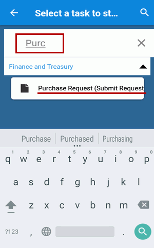A list of available tasks assigned to the current user will be shown. Tap on the "Purchase Request" process that was created.