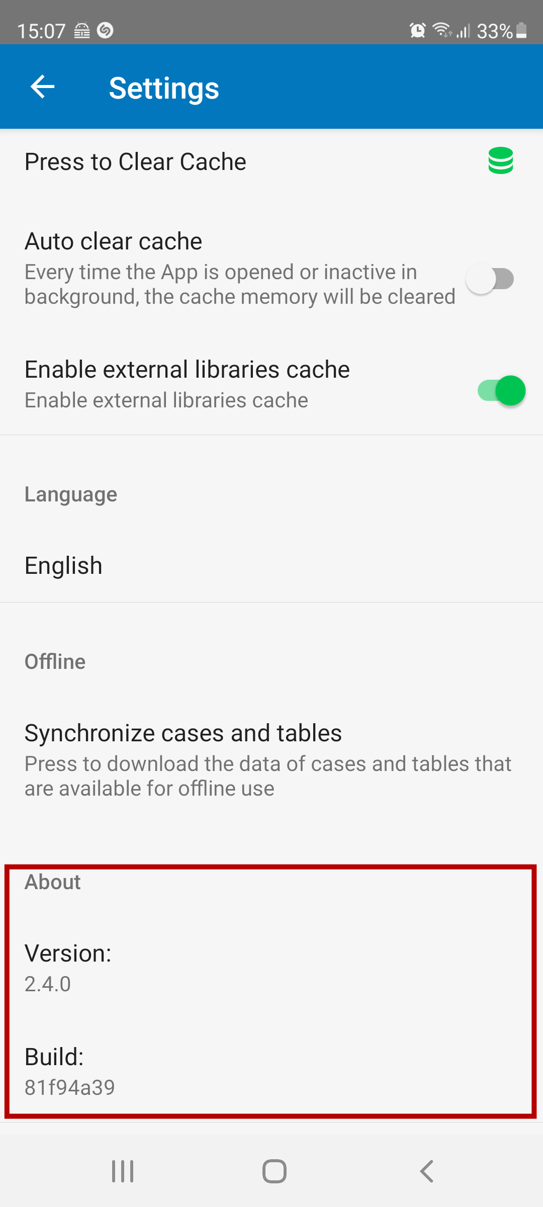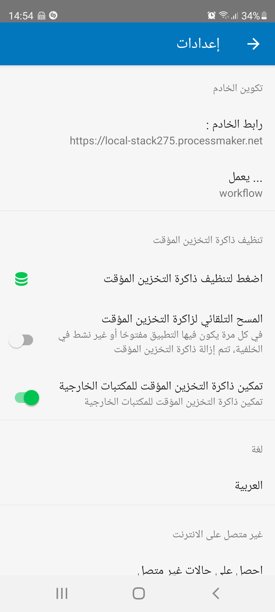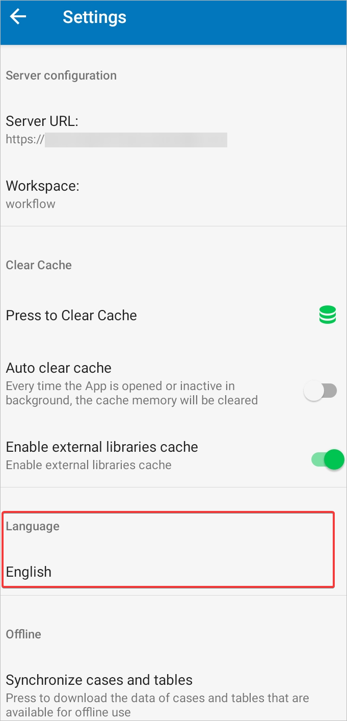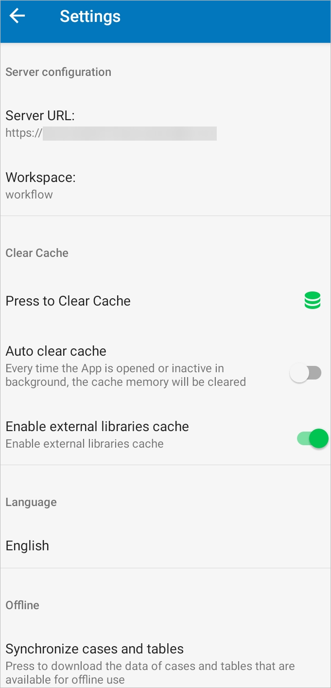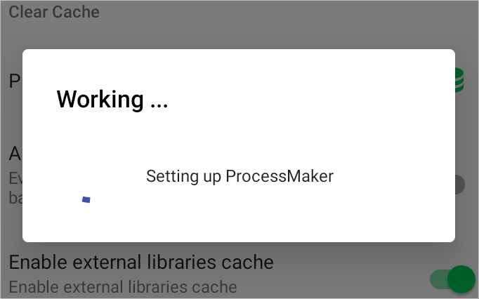 The Enable external libraries cache option is available to improve the performance of the ProcessMaker app. If this option is turned on, the JavaScript libraries are downloaded in the device cache to load Dynaforms and sub-forms faster.