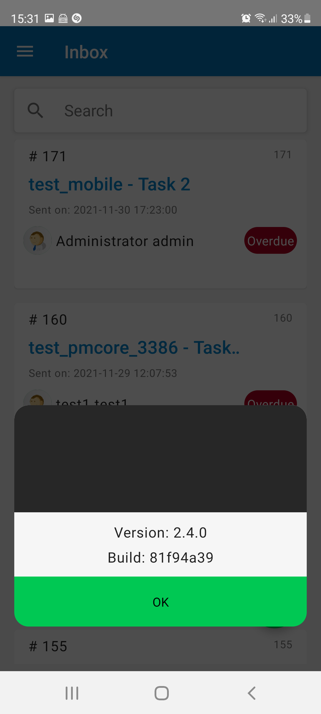 This option displays the installed ProcessMaker Mobile version and build in your device. The About information also displays when the ProcessMaker Mobile is without a logged user.