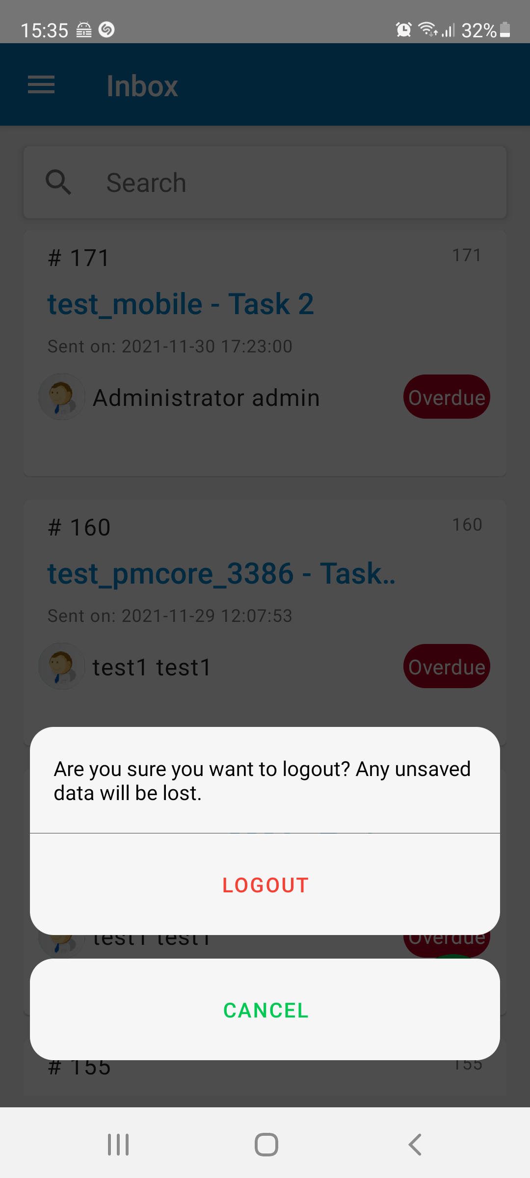 Go to the main menu by sliding the screen to the right. Tap the Logout option. The Logout option asks Are you sure you want to logout? Any unsaved data will be lost. Tapping Logout quits the ProcessMaker app and go back to the main screen. Otherwise tap Cancel.