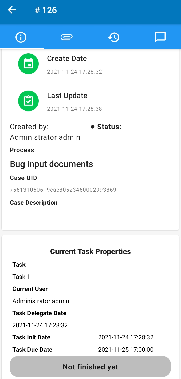 The Files Attached panel lists documents uploaded and generated when the case was running in the ProcessMaker Web edition. In ProcessMaker Mobile, to see this option when running a case in the Case Tabs, tap the Clip tab.