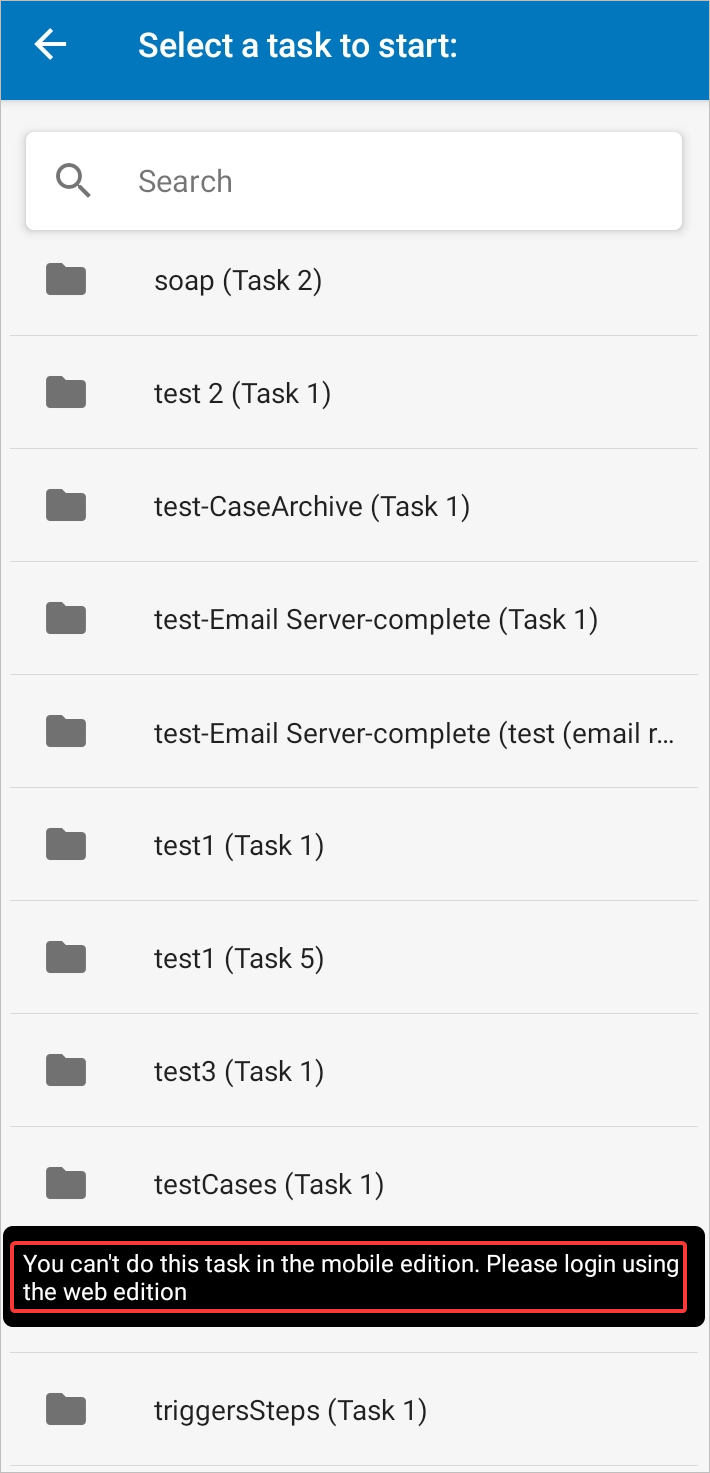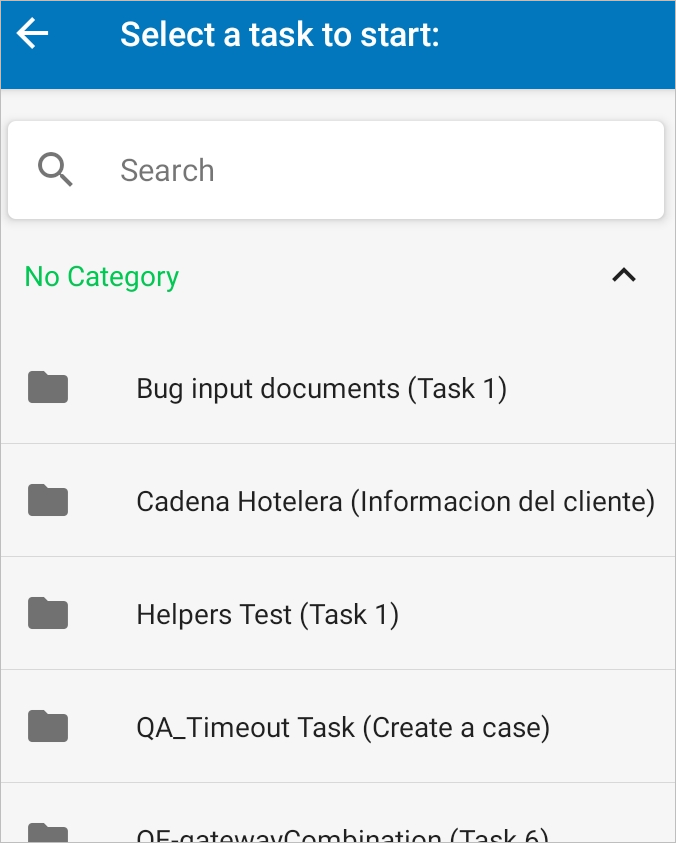 All of your available starting tasks of processes are listed on the screen. Tap a specific task to start a case or search for a process and then choose the desired task.