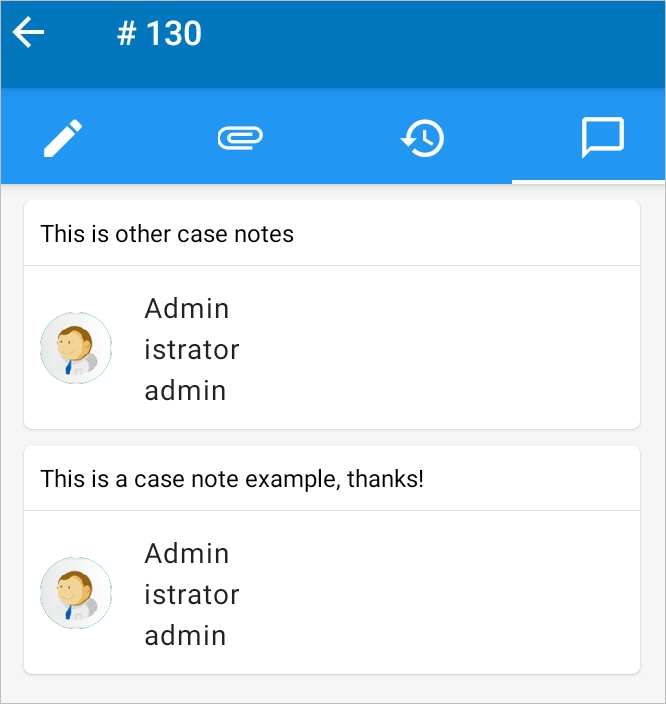 Each case note includes the note text, the people who wrote the note, the date and the time when the note was written.