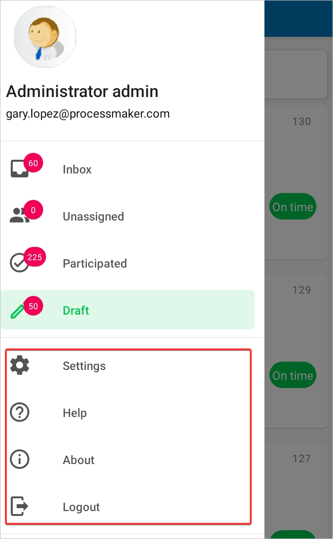 This option displays the installed ProcessMaker Mobile version and build in your device. Go to the main menu by sliding the screen to the right. Tap the About option.
