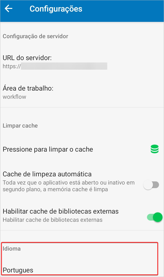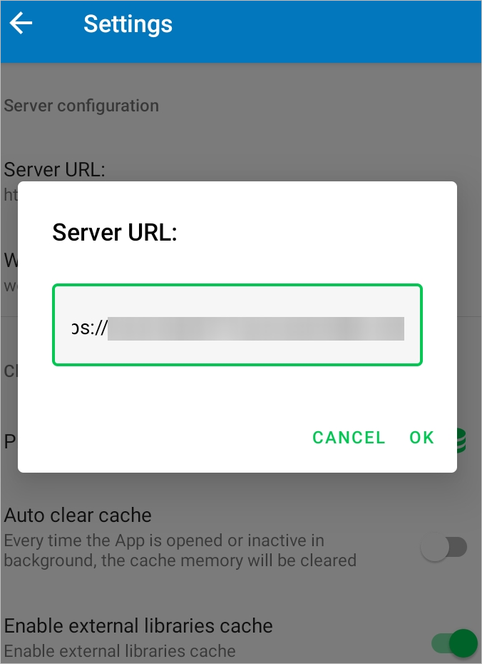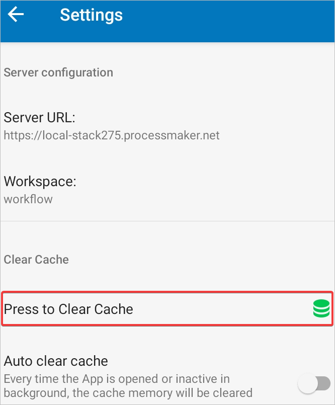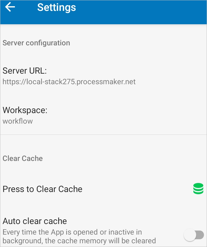 Note: When using Clear Cache functionality, the default Server URL is set up to Https. Since ProcessMaker Mobile App only works with Secure Domain Services, it is mandatory to use HTTPS URL.