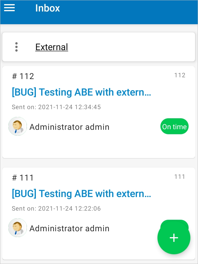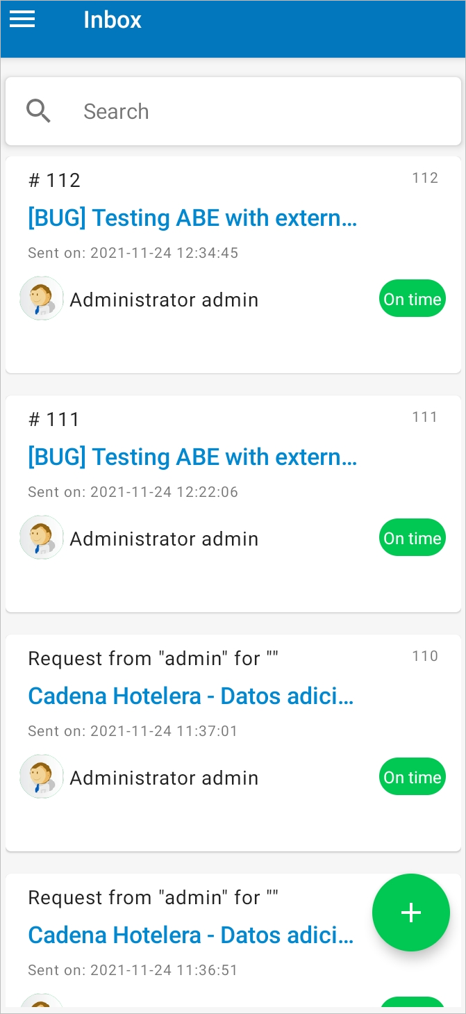 The Inbox panel lists all the cases assigned to you. The cases are sorted first by their case number, and then by the name of the case. The list displays cases with one of the following tree case statuses: On time, At risk or Overdue. Cases that can be worked offline are marked with the label "Available Offline." To learn more about offline cases, see ProcessMaker Offline Mobile.