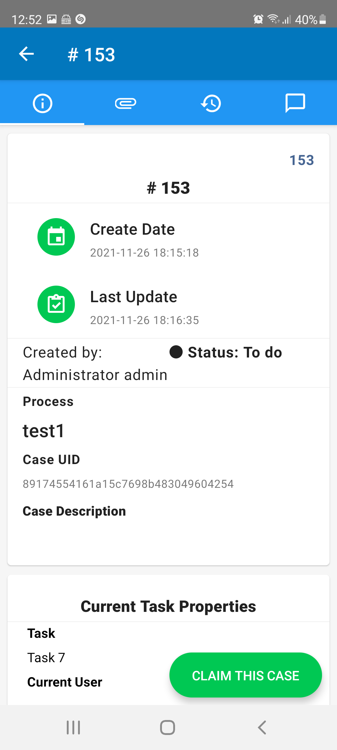 - If the case has been accessed from the Unassigned tray, the main case view displays the case summary, the current task properties and also the Claim This Case button at the right-bottom of the screen.