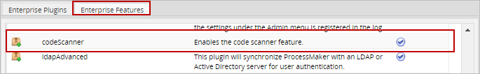 Make sure the acquired license includes this feature by going to Admin > Plugins > Enterprise Manager. Go to the second panel and click on the Enterprise Features tab. The codeScanner feature must be listed among the features and it must have the check mark besides it.