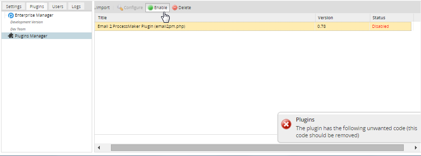 • Code scanning when a custom plugin is imported (it does not include ProcessMaker plugins)