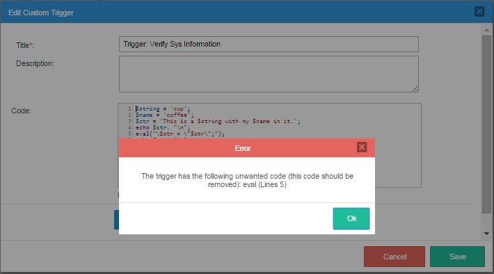 • Code scanning when executing a case of a process that has triggers in the steps of its tasks (if the trigger has undesired code, it is not executed).