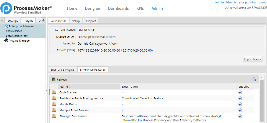 When the Enterprise Edition is installed with its license, the Plugin/Trigger Code Security Scanner feature becomes available. Go to ADMIN > Plugins > Enterprise Manager > Enterprise Features to verify that the codeScanner feature is installed and enabled.